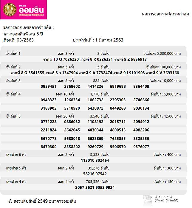 ผลสลากออมสินพิเศษ 5 ปี วันที่ 1 มีนาคม 2563 march 1, 2020 ผลสลากออมสินพิเศษ 3 ปี วันที่ 16 กุมภาพันธ์ 2563 สลากออมสินพิเศษดิจิทัล 1 ปี งวด 16 ต.ค. ระหว่างสลากออมสิน 20 บาท กับ สลาก ธ.ก.ส. อันดับที่ 1 ออก 3 ครั้ง 3 อันดับ อันดับละ 5,000,000 บาท